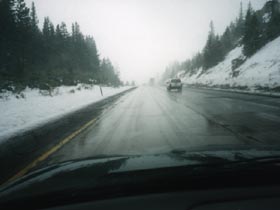 | カリフォルニアの北端に近い山を通る頃には 雨が吹雪に変わっていた しかし予想外の雪景色に意味もなくはしゃぐ♪ |